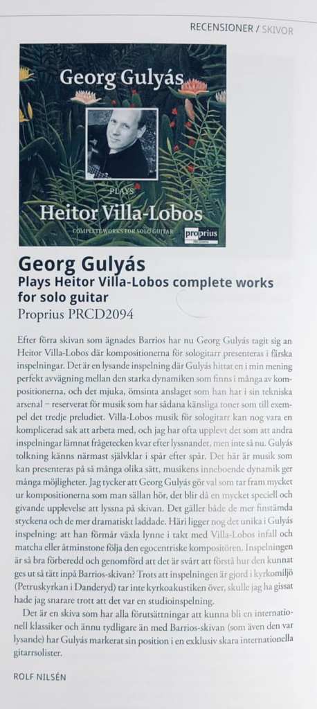Det är en skiva som har alla förutsättningar att kunna bli en internationell klassiker … Gulyás har markerat sin position i en exklusiv skara internationella gitarrsolister.